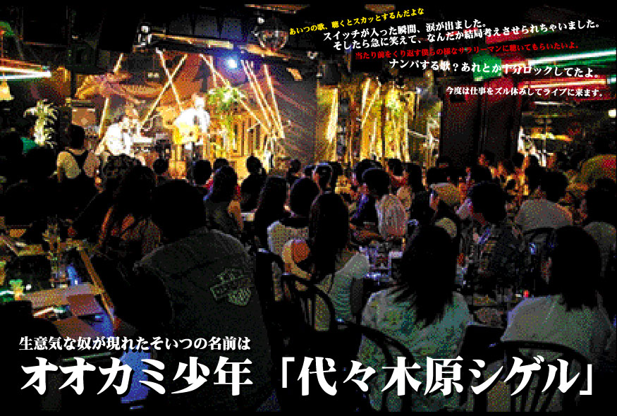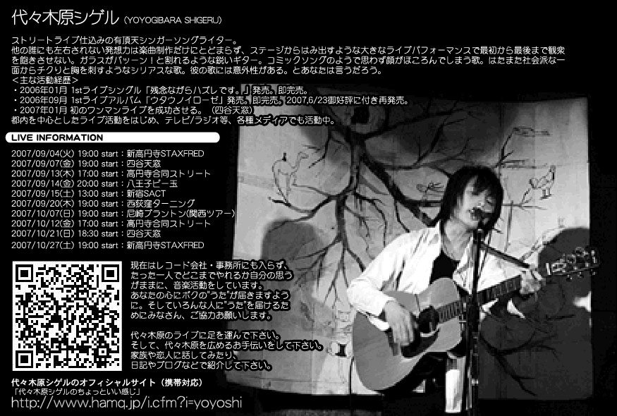 人が好きなんだ。ボクの歌を聴かして、笑ってもらいたいんだ。もちろん泣いてももらいたいし、考えてももらいたい。要するにライブをするのはこれを読んでくれてるキミと会う口実なのかもしれない。これを読んで、「なー代々木原、ダメじゃーん!」とか言われても良いよ。それくらいシンプルに物事を考えなくちゃ、ボクは混乱してしまうのだから。